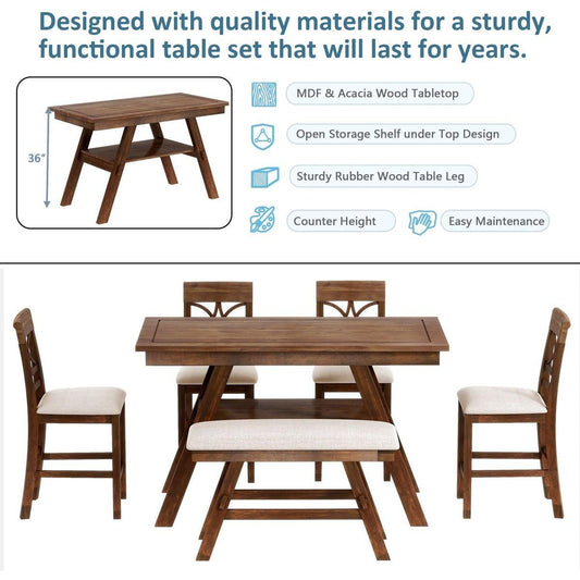 6-Piece Wood Counter Height Dining Table Set with Storage Shelf, Kitchen Table Set with Bench and 4 Chairs,Rustic Style, Walnut+Beige Cushion