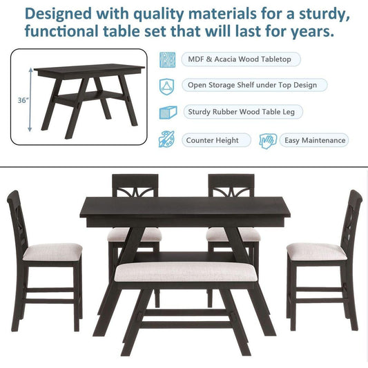 6-Piece Wood Counter Height Dining Table Set with Storage Shelf, Kitchen Table Set with Bench and 4 Chairs, Rustic Style, Espresso+Beige Cushion