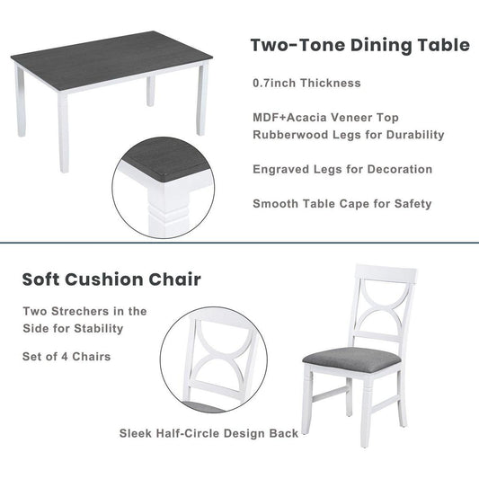 6-Piece Wood Dining Table Set Kitchen Table Set with Upholstered Bench and 4 Dining Chairs, Farmhouse Style, Gray+White