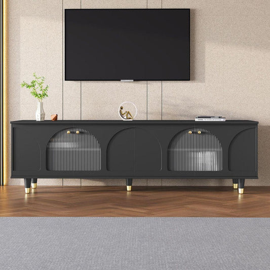 Contemporary TV Stand with Adjustable Shelves for TVs Up to 78", Stylish Media Console with Gold Handles and Arch Fluted Glass Doors, Delicate Entertainment Center for Living Room, Black