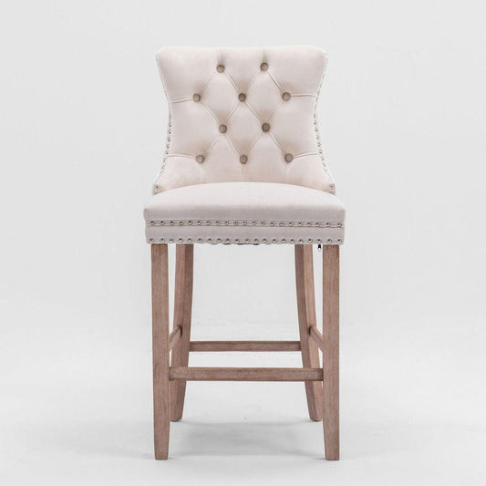 Contemporary Velvet Upholstered Barstools with Button Tufted Decoration and Wooden Legs, and Chrome Nailhead Trim, Leisure Style Bar Chairs,Bar stools, Set of 2 (Beige)