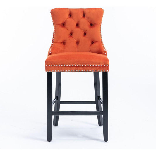 Contemporary Velvet Upholstered Barstools with Button Tufted Decoration and Wooden Legs, and Chrome Nailhead Trim, Leisure Style Bar Chairs,Bar stools, Set of 2 (Orange)