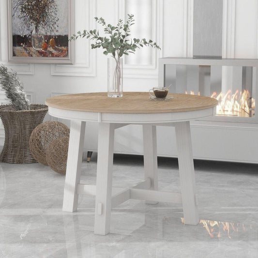 Farmhouse Round Extendable Dining Table with 16" Leaf Wood Kitchen Table (Oak Natural Wood + Antique White)