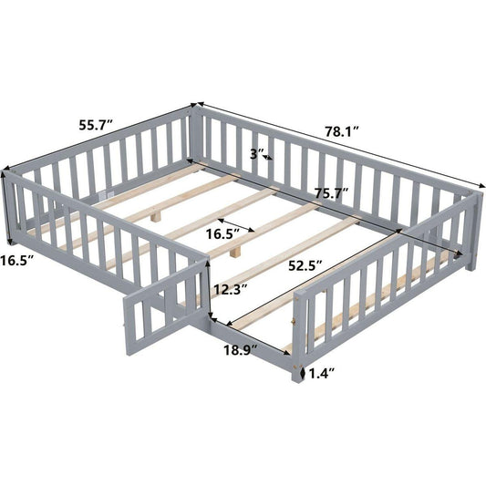 Full Size Floor Platform Bed with Fence and Door for Kids, Montessori Floor Bed Frame with Support Slats for Toddlers, Wooden Floor Bed Grey