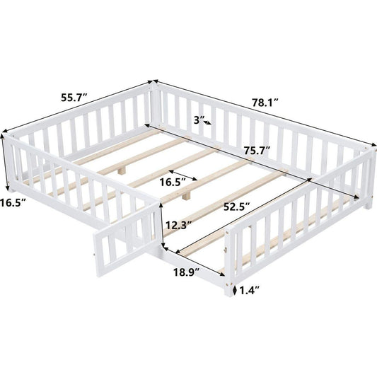 Full Size Floor Platform Bed with Fence and Door for Kids, Montessori Floor Bed Frame with Support Slats for Toddlers, Wooden Floor Bed White