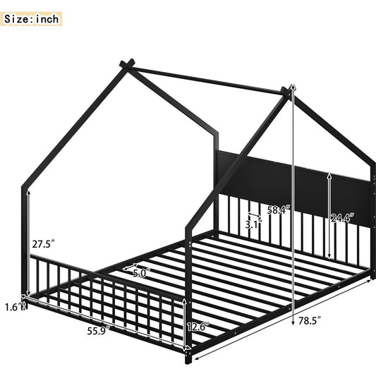 Full Size House Bed with Roof and Colorful Lights, Metal Bed Frame with Slats and Legs, House Bed for Boy, Girls and Young Teens, No Box Spring Needed (Black)