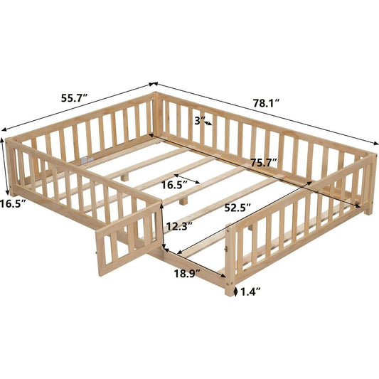 Full Size Floor Platform Bed with Fence and Door for Kids, Montessori Floor Bed Frame with Support Slats for Toddlers, Wooden Floor Bed Natural
