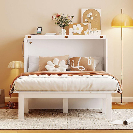 Full Size Murphy Bed with USB Port and removable Shelves on Each Side,White