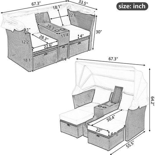 2-Seater Outdoor Patio Daybed Outdoor Double Daybed Outdoor Loveseat Sofa Set with Foldable Awning and Cushions for Garden, Balcony, Poolside, Grey