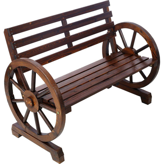 2-Person Wooden Wagon Wheel Bench for Backyard, Patio, Porch, Garden, Outdoor Lounge Furniture w/Rustic Country Design, Slatted Seat and Backrest - Brown