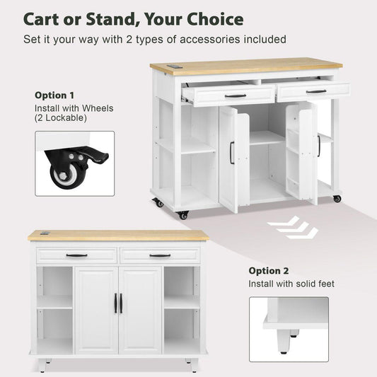 K&K 48inch Large Kitchen Island with 2 Bar Stools, Power Outlet, Door Internal Storage Rack, Kitchen Storage Cart on 5 Wheels with Drop Leaf, 5 Open Side Racks, 2 Drawers,for Kitchen,Dining Room,White