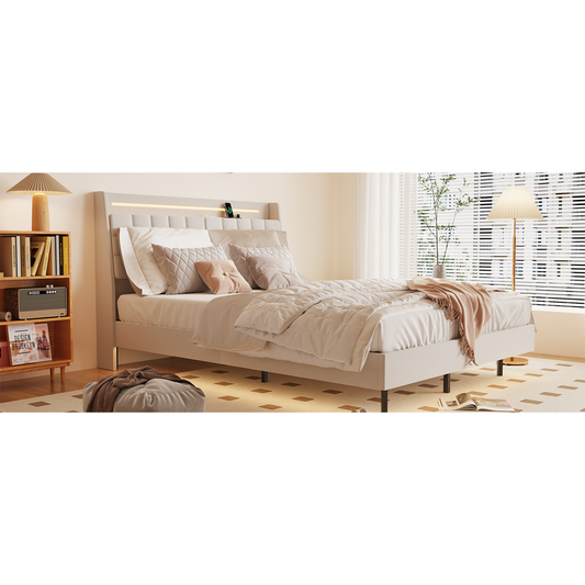 King Floating Bed Frame with LED Light and Charging Station Upholstered Platform Bed Frame King Size with Headboard and Hidden Storage Space, No Box Spring Needed, Beige
