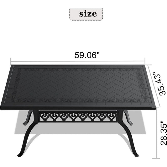 L59.05xW35.43-inch Cast Aluminum Patio Dining Table With Black Frame and Carved Texture on the Tabletop