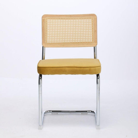 Mid Century Modern Dining Chairs Set of 2, Velvet Accent Chairs with Natural Cane Back & Stainless Chrome Base, Famous Breuer Designed Chairs, Upholstered Rattan Kitchen Chairs,Golden