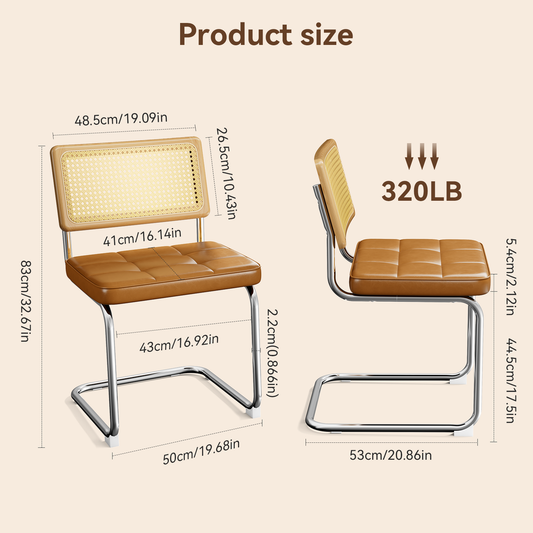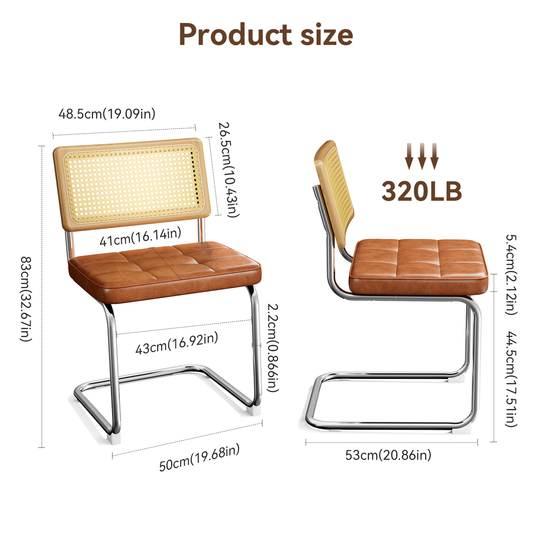 Natural Rattan Dining Chairs Set of 2, Modern Dining Room Chairs with Solid Wood Back for Kitchen Living Room, Mid Century Breuer Design Inspired, Upholstered Faux Leather (Brown)