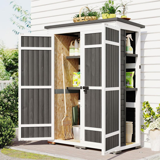 Outdoor 5.5ft Hx4.1ft L Wood Storage Shed, Garden Tool Cabinet with Waterproof Asphalt Roof, Four Lockable Doors, Multiple-tier Shelves, White and Gray