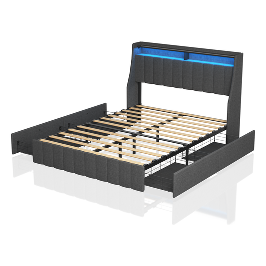 Queen Size Bed Frame with LED, 4 Under-bed Portable Storage Drawers, Wings Headboard Design, Dark Grey