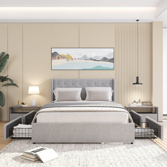 Queen Size Bed Frame with 4 Storage Drawers and Wingback Headboard, Button Tufted Design, Light Grey