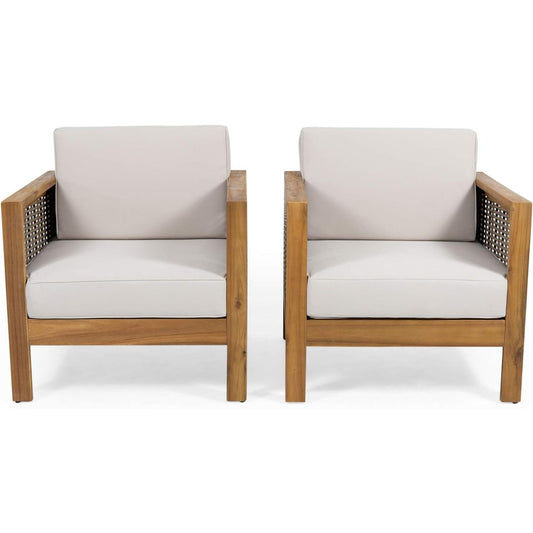 Set of 2, Acacia Wood and Wicker Outdoor Club Chair, Deep Seating with Soft Cushion, Porch Chairs for Garden, Backyard Porch Balcony, Brown & Beige