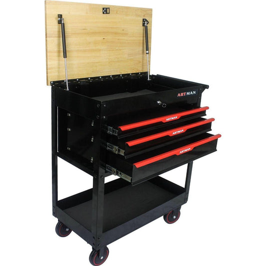 3 DRAWERS MULTIFUNCTIONAL TOOL CART WITH WHEELS AND WOODEN TOP