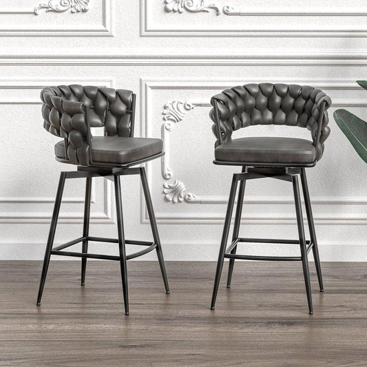 Technical Leather Woven Bar Stool Set of 2,Black legs Barstools No Adjustable Kitchen Island Chairs,360 Swivel Bar Stools Upholstered Counter Stool Arm Chairs with Back Footrest, (Tan)