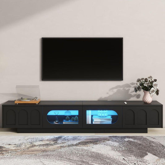 TV Stand with Fluted tempered Glass Doors for TVs Up to 95", Functional Media Console with Arched Cabinet Doors, Entertainment Center with APP-Controlled LED Light for Living Room, Black
