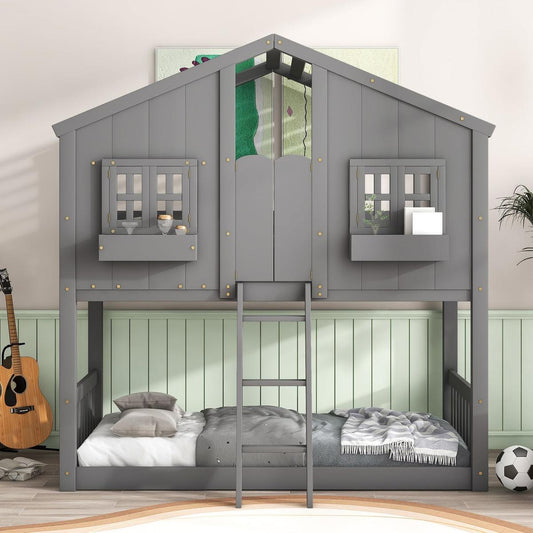 Twin over Twin House Bunk Bed with Roof, Window, Window Box, Door, with Safety Guardrails and Ladder, Grey