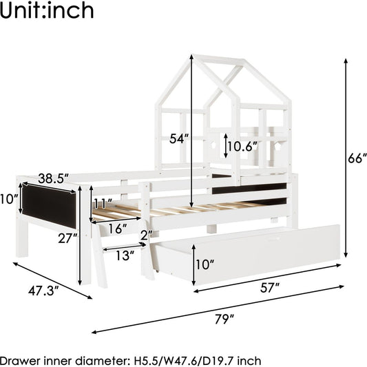 Twin Size House Bed with Ladder and Storage Drawers for Kid Bedroom,Solid Wood Platfrom Bedframe with 2 Blackboard Design, No Box Spring Needed, White