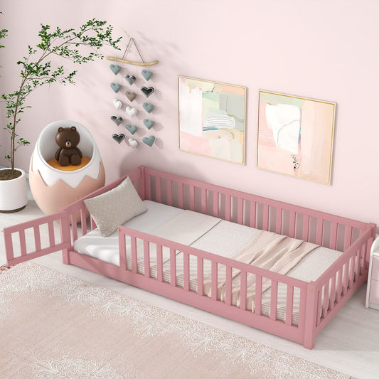 Twin size Floor Platform Bed with Fence and Door ,Pink