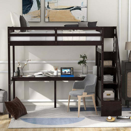 Twin Size Loft Bed with Storage Staircase and Built-in Desk, Espresso