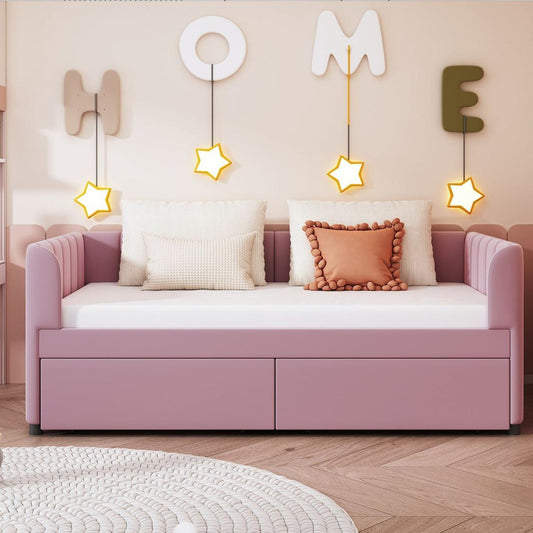 Twin Size Upholstered Daybed with Ergonomic Design Backrest and 2 Drawers, Pink