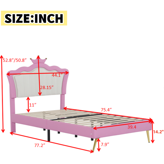 Twin Size Upholstered Bed Frame with LED Lights, Modern Upholstered Princess Bed with Crown Headboard, Pink+White