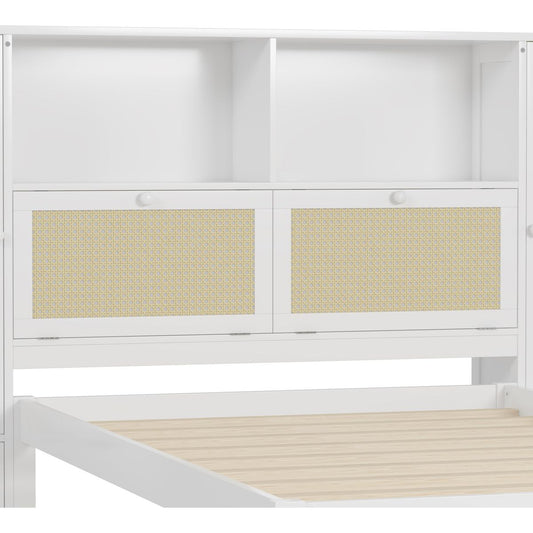 Twin Size Wooden Bed with Two Storage Lockers, Drawer, and Storage Shelf on Headboard, Multifunctional Platform Bed with Natural Rattan, White