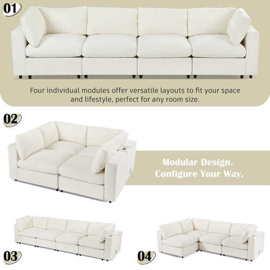 U-Shaped Couch Modern 4 seats Sofa Chair with Storage, with 2 Ottomans, Deep Seat Sofa with Cup Holders & Phone Holder , Beige Corduroy Couch for Living Room