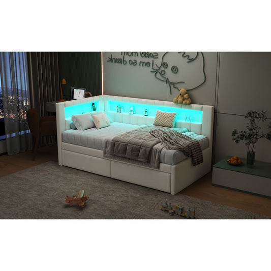Upholstered Twin Size Platform Bed with USB Ports and LED Belt, With 2 Drawers, White