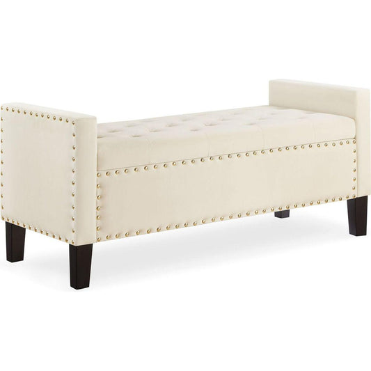 Upholstered Tufted Button Storage Bench with nails trim,Entryway Living Room Soft Padded Seat with Armrest,Bed Bench - Cream