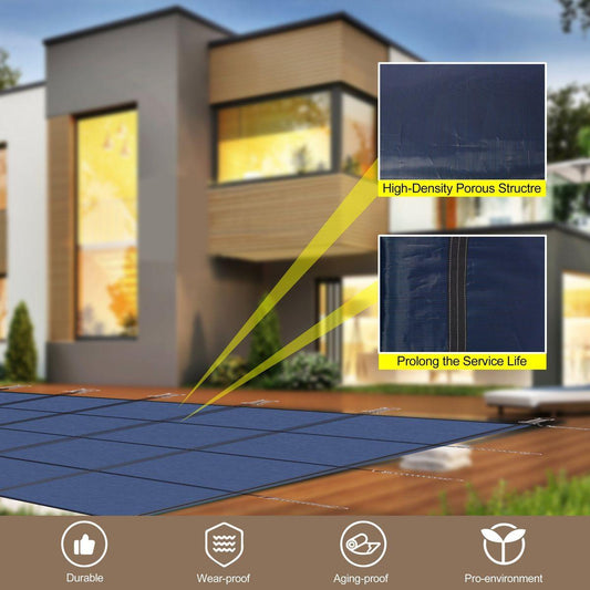 Pool Safety Cover, Fits 16x32ft Rectangular Inground Winter Swimming Pools, with 4x8ft Center End Step, Triple Stitched, High Strength Mesh PP, Great Rain Permeability, Installation Hardware,Blue Mesh