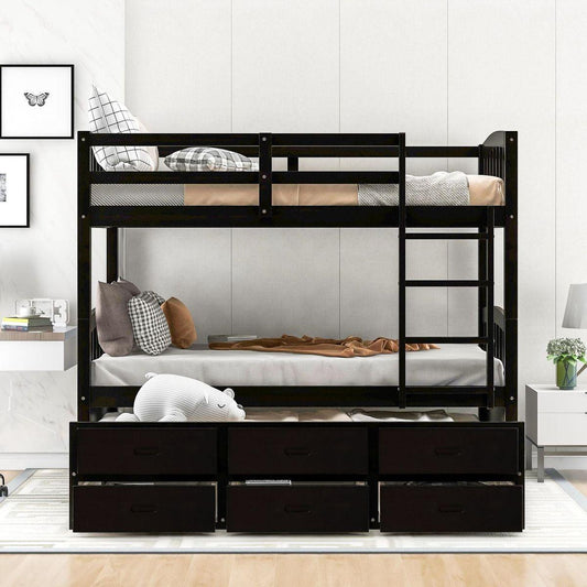Twin over Twin Wood Bunk Bed with Trundle and Drawers, Espresso