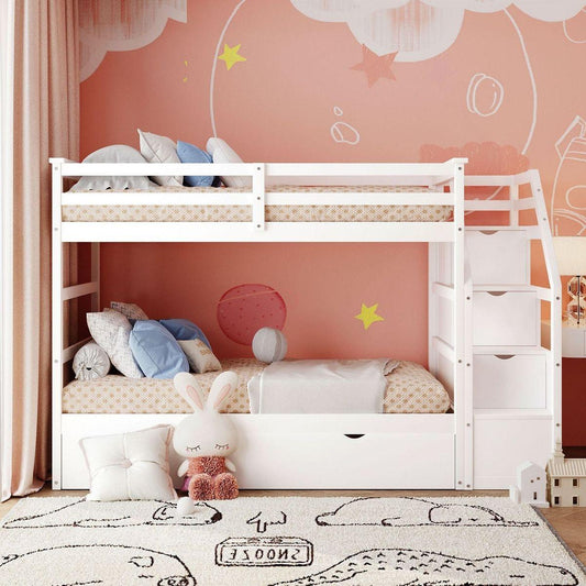 Twin-Over-Twin Bunk Bed with Twin Size Trundle and 3 Storage Stairs, White