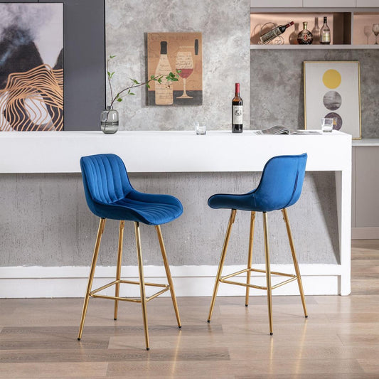 26 Inch Set of 2 Bar Stools, with Steel Frame Footrest Velvet Fabric Golden Leg Simple Bar Stool, BLUE