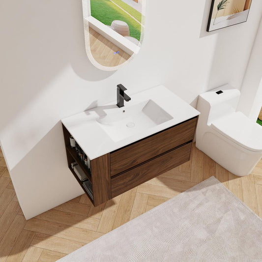 36" Wall Mounting Bathroom Vanity With Ceramic Sink, Soft Close Drawer
