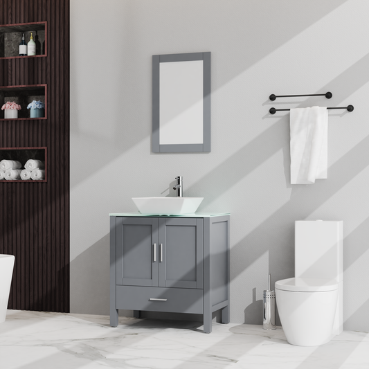 30" Bathroom Vanity and Sink Combo Glass Top Cabinet w/Mirror, Gray