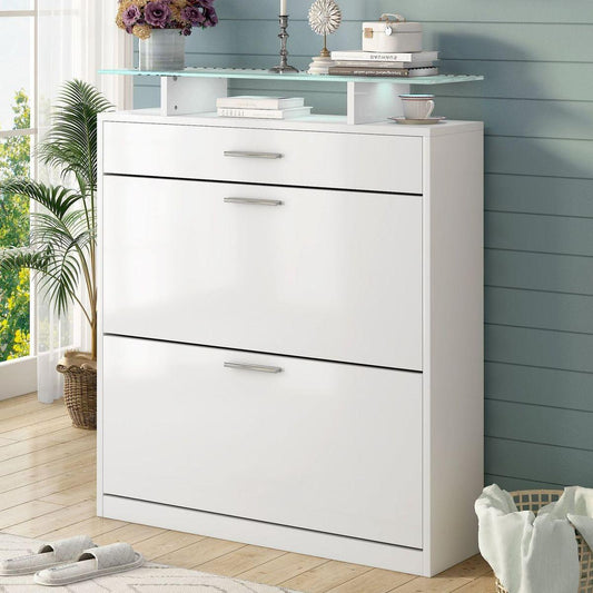 Slim Entryway Organizer with 2 Flip Drawers, Tempered Glass Top Shoe Storage Cabinet with Drawer, Free Standing Shoe Rack with LED Light for Hallway, White