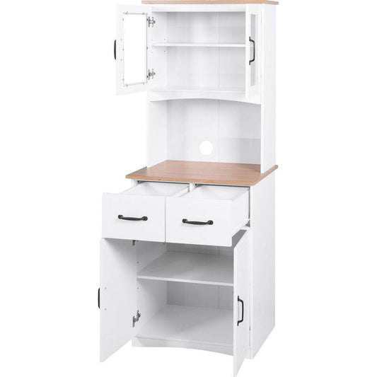 Wooden Kitchen Cabinet White Pantry Room Storage Microwave Cabinet with Framed Glass Doors and Drawer