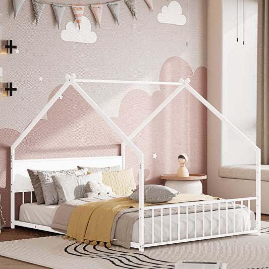Full Size House Bed with Roof and Colorful Lights, Metal Bed Frame with Slats and Legs, House Bed for Boy, Girls and Young Teens, No Box Spring Needed (White)