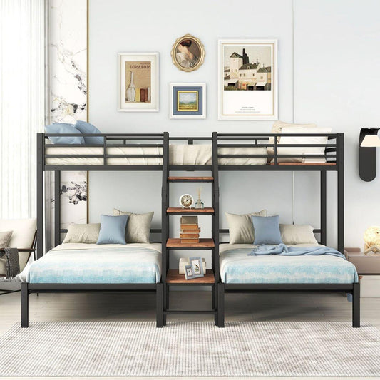 Metal Twin over Twin & Twin Bunk Bed, Triple Bunk Bed with Storage Shelves Staircase, Black