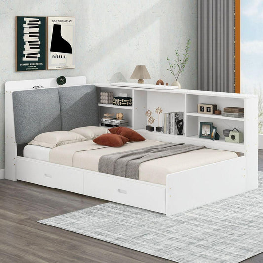 Wood Twin Size platform bed with Storage Headboard, Shelves and 2 Drawers, White