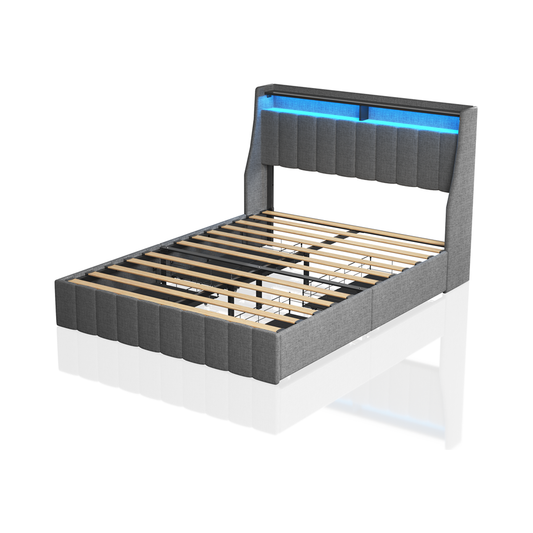 Full Size Bed Frame with LED, 4 Under-bed Portable Storage Drawers, Wings Headboard Design, Light Grey