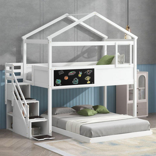 Twin over Full House Bunk Bed with Storage Staircase and Blackboard,White
