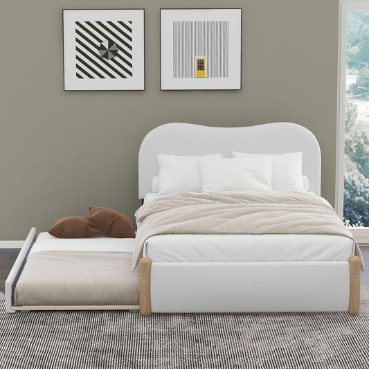 Full Size Upholstered Platform Bed with Wood Supporting Feet and Twin Size Trundle, White